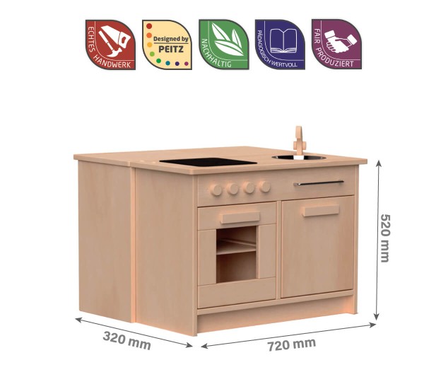 Entwickelt für den Kindergarten, kann der Küchenblock freistehend im Raum als Inselblock-Küche aufgestellt und beidseitig bespielt werden. Dabei ist die robuste Bauweise aus massivem Buchenholz ideal für den intensiven Kita-Alltag. Ein Hingucker in jedem Raum und echtes pädagogisches Highlight.