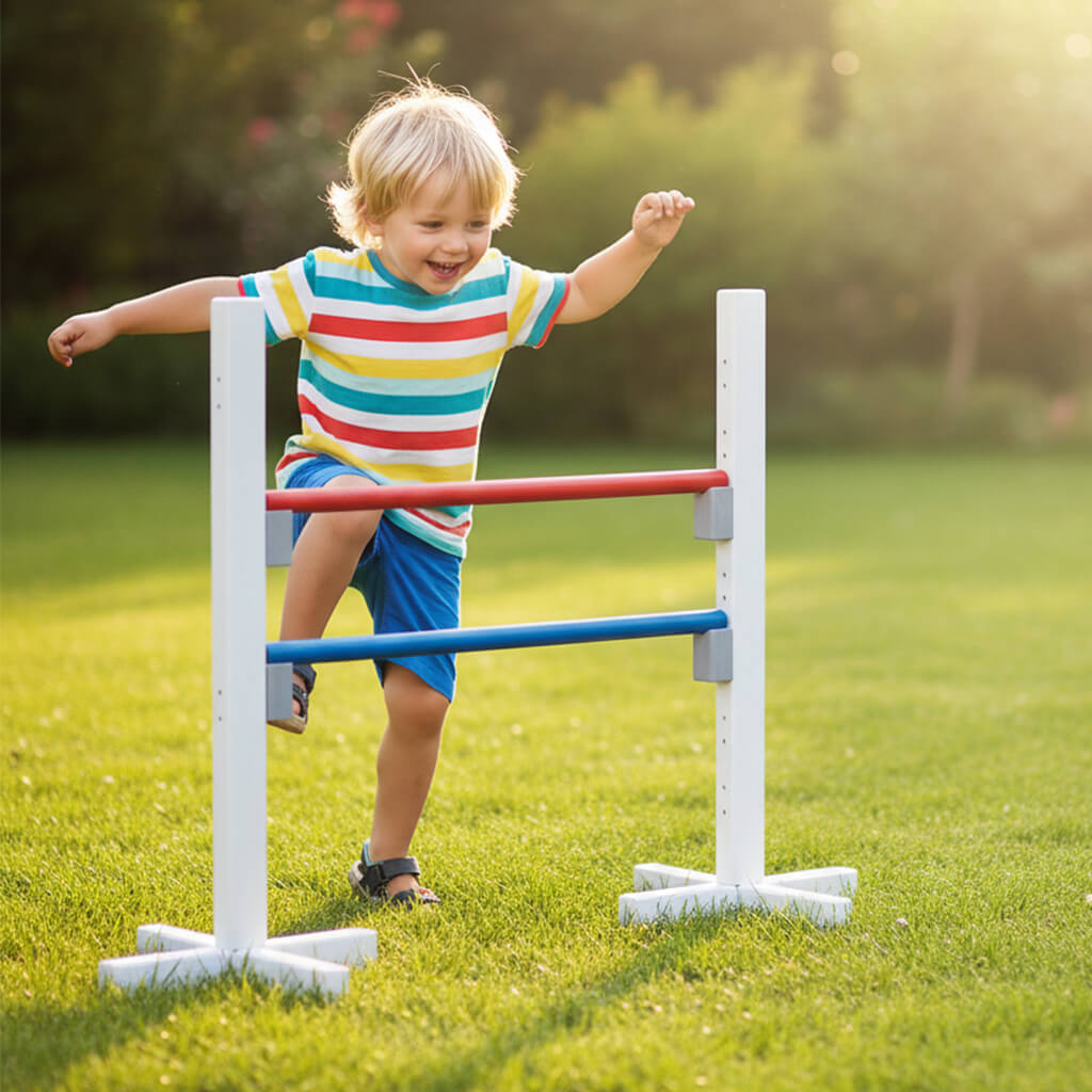 Unterstützen Sie die Bewegung und Motorik Ihrer Kinder auf spielerische Weise. Das Hindernis Springhürde-Spiel fördert ihre Sprungkraft, Ausdauer und Koordination.