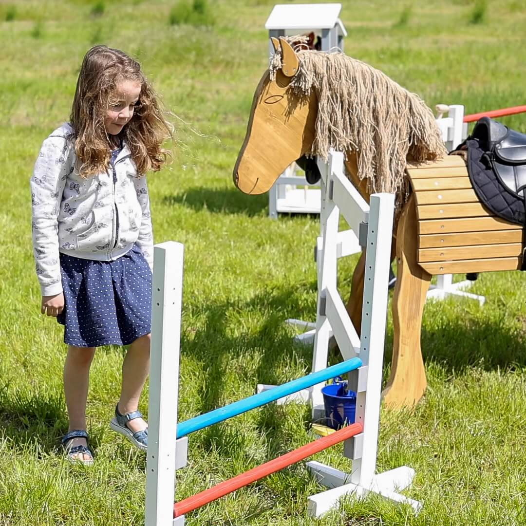 Entdecke die vielseitigen Möglichkeiten des Kinder Springhürde-Systems! Dieses Spielzeug kann sowohl als Hindernis Springhürde für Steckenpferde als auch als Leitergolf-Wurfspiel genutzt werden. Aber das ist noch nicht alles - indem Sie das Erweiterungs-Set 7037.1 erwerben, können Sie das Springhürde-System erweitern und als Zaun verwenden!