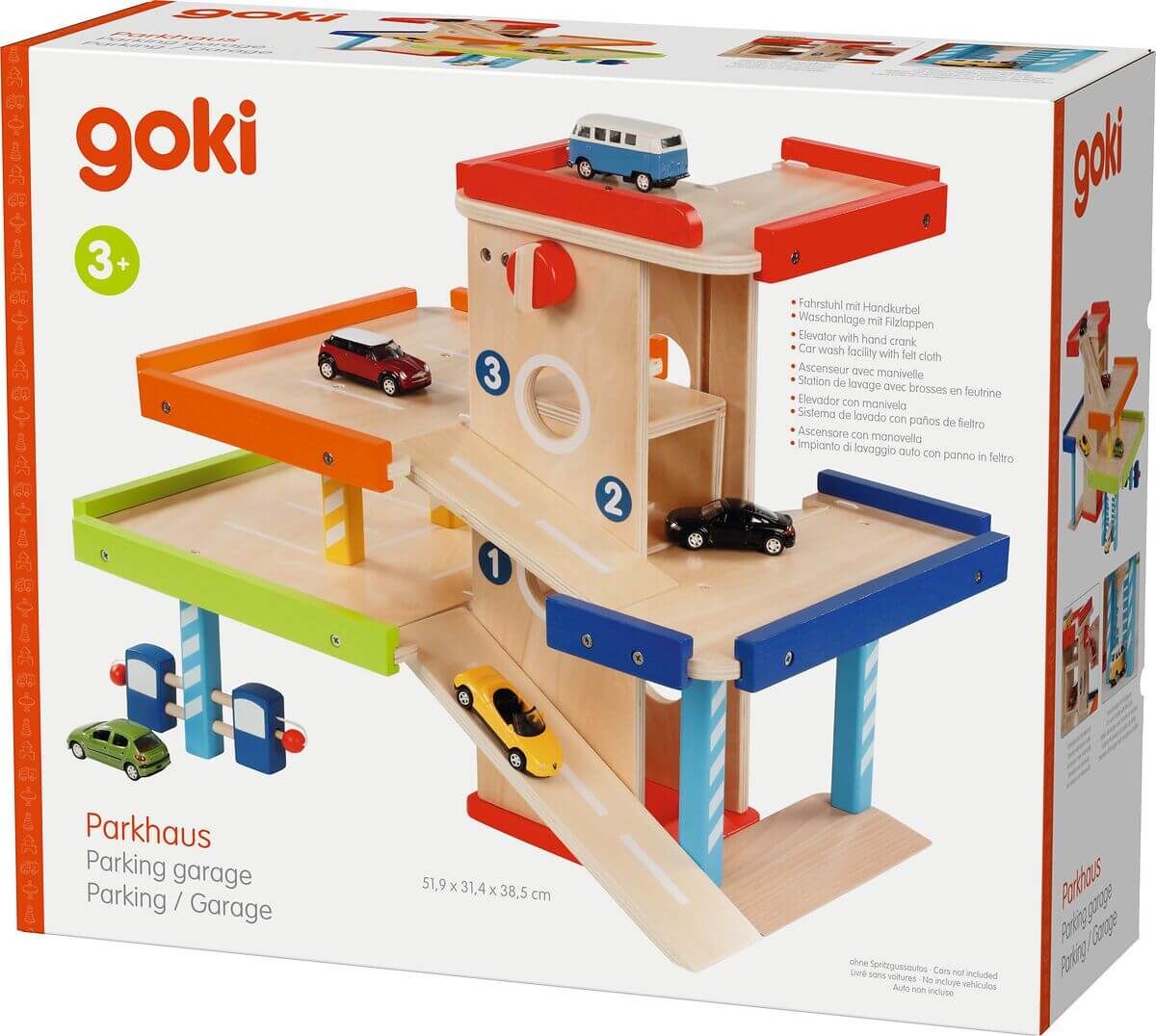 Entdecken Sie das perfekte Holzspielzeug für kleine Auto-Fans! Dieses dreistöckige Parkhaus bietet unendlich viel Spielspaß: Tanken Sie Ihre Fahrzeuge an den zwei Zapfsäulen auf oder fahren Sie sie mit der Handkurbel bequem per Aufzug in die verschiedenen Etagen. Für blitzsaubere Autos sorgt die Waschanlage mit weichen Filzlappen. Die stabilen Rampen lassen sich ganz einfach anbringen und ermöglichen abwechslungsreiches Spielvergnügen.