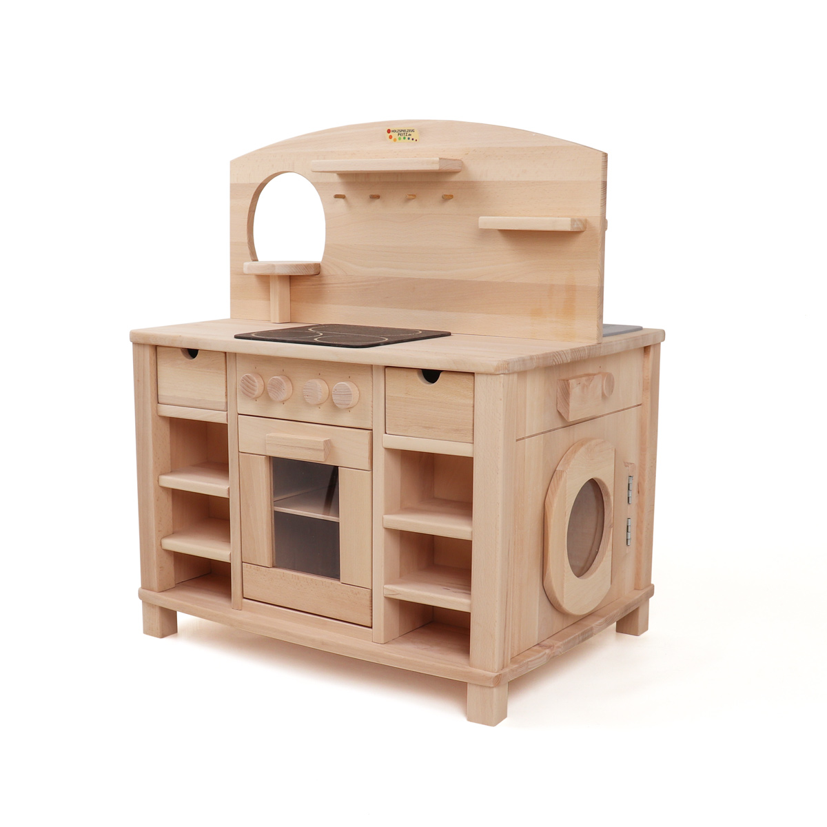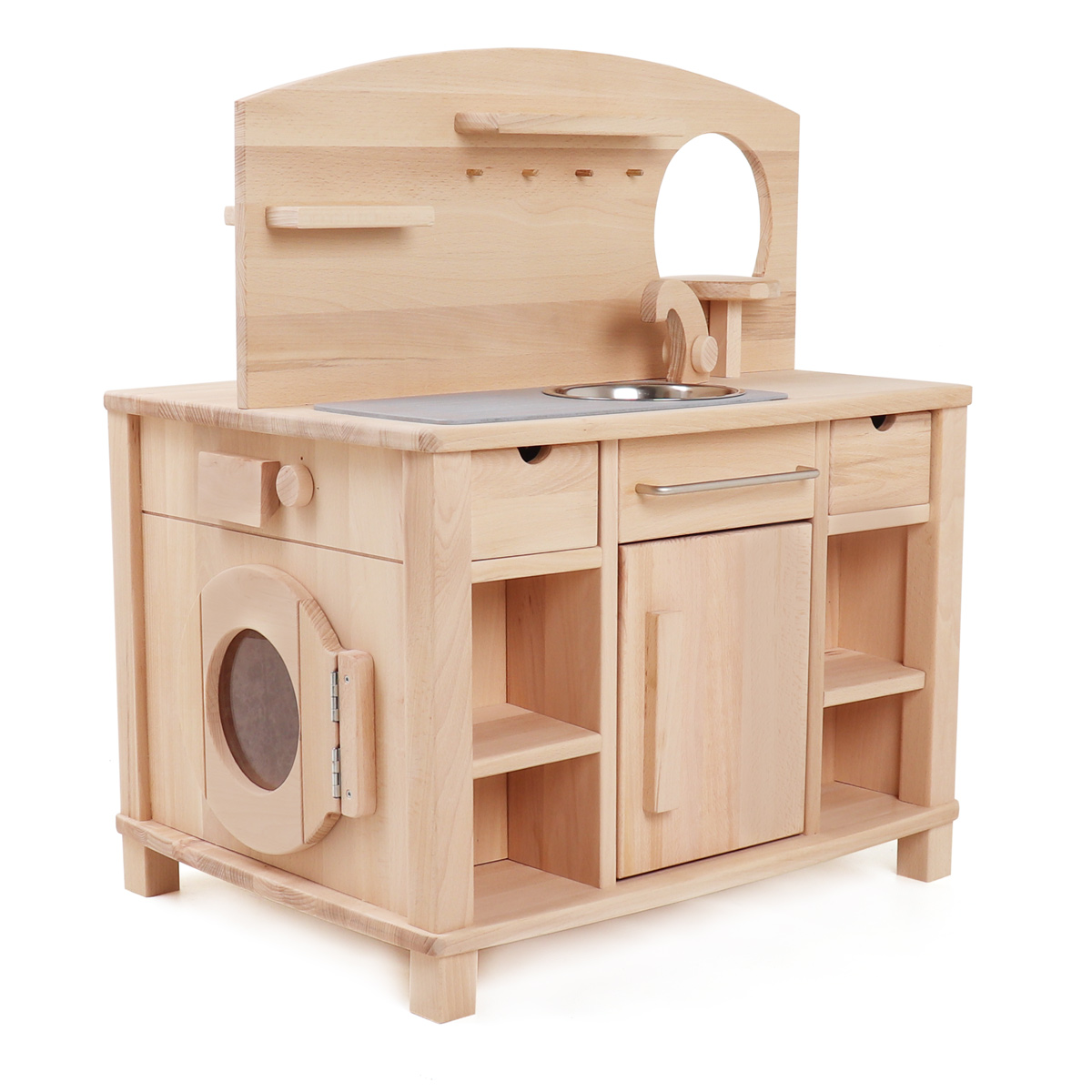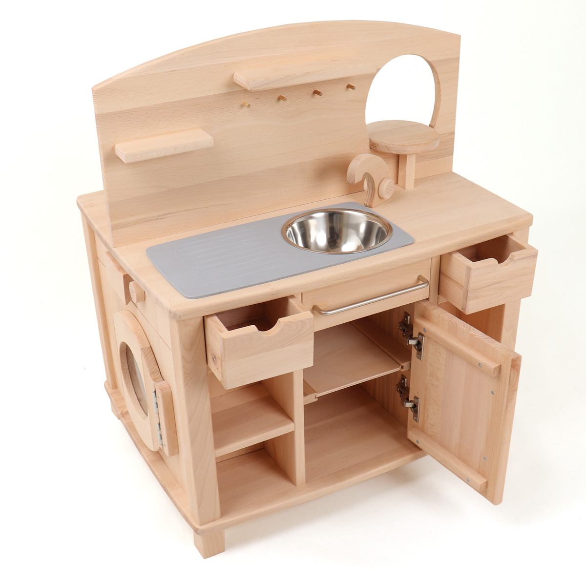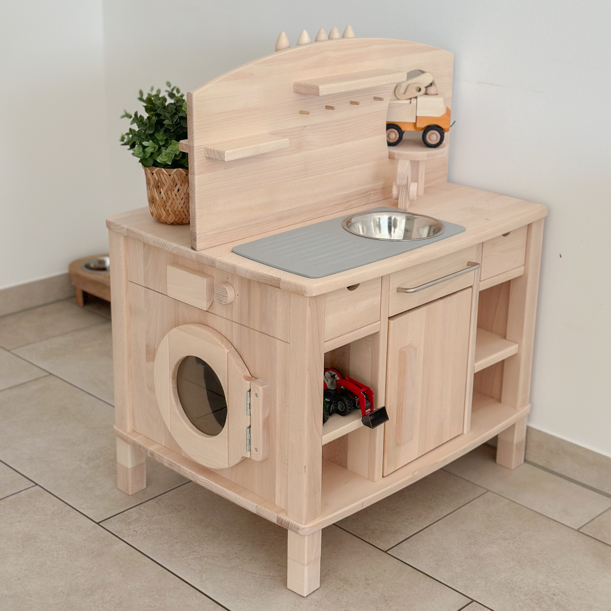 Die beiden verbliebenen Seiten der Kinderküche sind mit einer Kinderwaschmaschine und einer Kinderspülmaschine ausgestattet. Die Spülmaschine der Kinderküche, eine Neuheit unter unseren Spielküchen aus Holz, verfügt über zwei drehbare Knöpfe mit Klickgeräusch und einen Schnappverschluss. Als Spülkörbe dienen zwei von Rillen durchsetzte Holzbretter. Wo auch Kinderteller zum Spülen hineingestellt werden können die bei uns in Kategorie Kinderkochgeschirr und Töpfe.