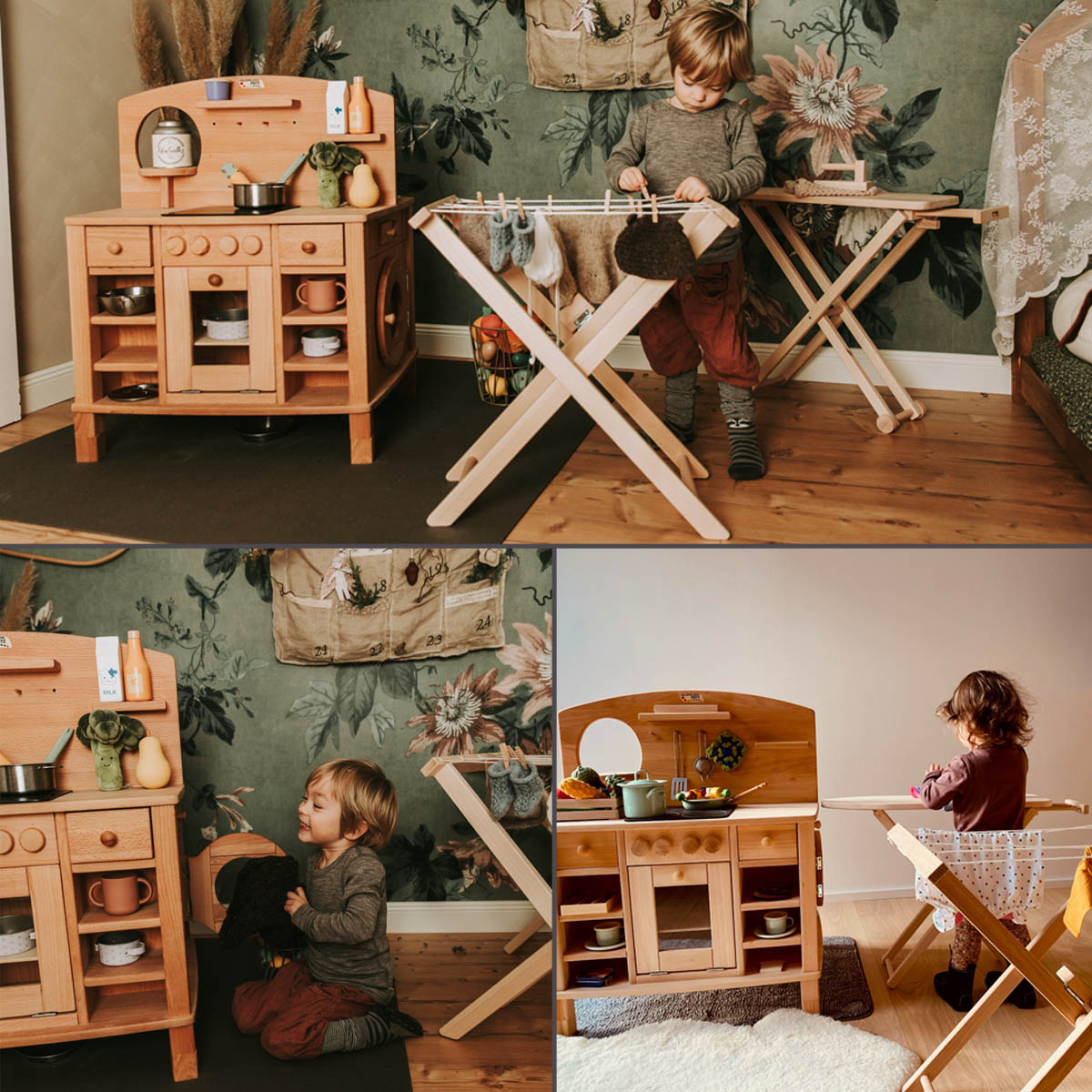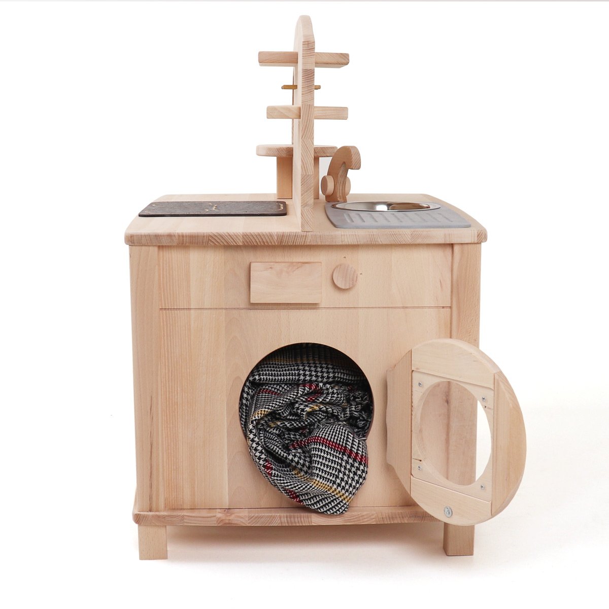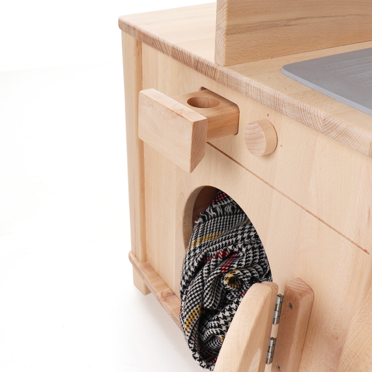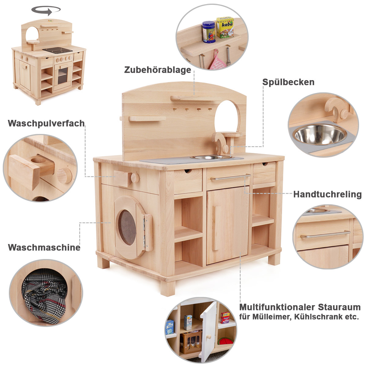 Die beiden verbliebenen Seiten der Kinderküche sind mit einer Kinderwaschmaschine und einer Kinderspülmaschine ausgestattet. Die Spülmaschine der Kinderküche, eine Neuheit unter unseren Spielküchen aus Holz, verfügt über zwei drehbare Knöpfe mit Klickgeräusch und einen Schnappverschluss. Als Spülkörbe dienen zwei von Rillen durchsetzte Holzbretter. Wo auch Kinderteller zum Spülen hineingestellt werden können die bei uns in Kategorie Kinderkochgeschirr und Töpfe.