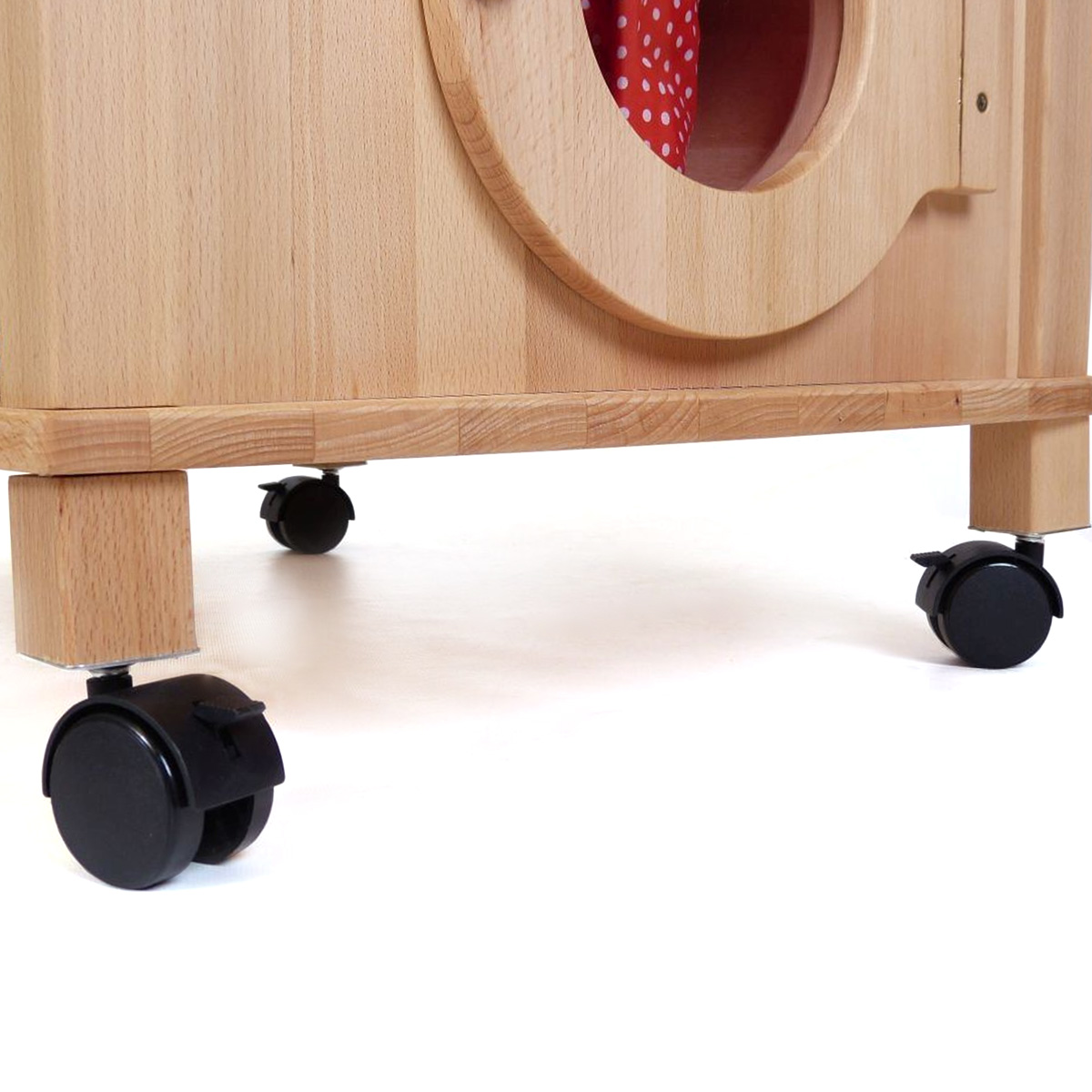 Auf der anderen Seite der Spielküche finden Sie eine Kinderwaschmaschine. Neben dem drehbaren, klickenden Knopf zum Ein- oder Ausschalten Der Kinderwaschmaschine befindet sich -wie im echten Leben- ein herausziehbares Waschpulverfach mit zwei Vertiefungen zum Einfüllen des Waschpulvers. In die Waschmaschinentür, die mit einem Schnappverschluss versehen ist, ist eine Acrylglasscheibe eingearbeitet, die den Blick bei der Spielküche auf das Innere der kreisrunden Waschtrommel freigibt.