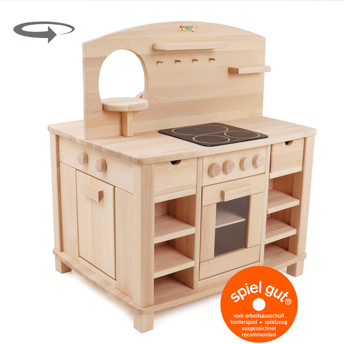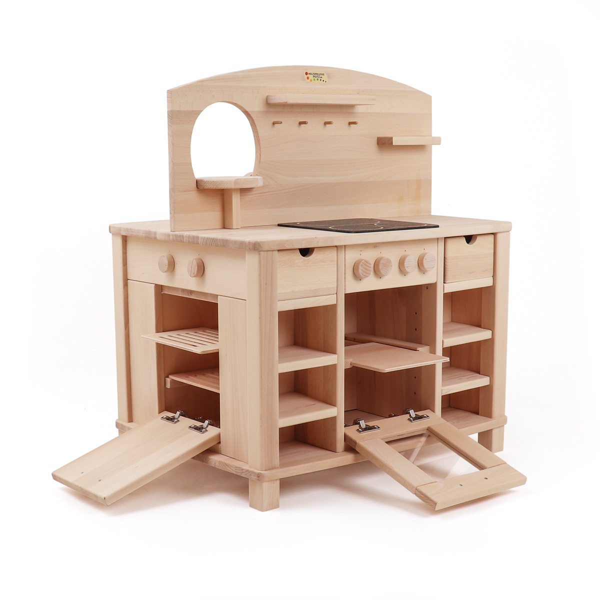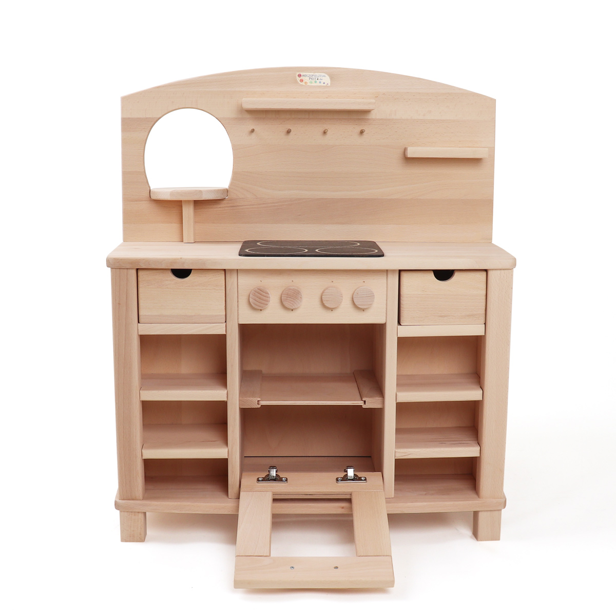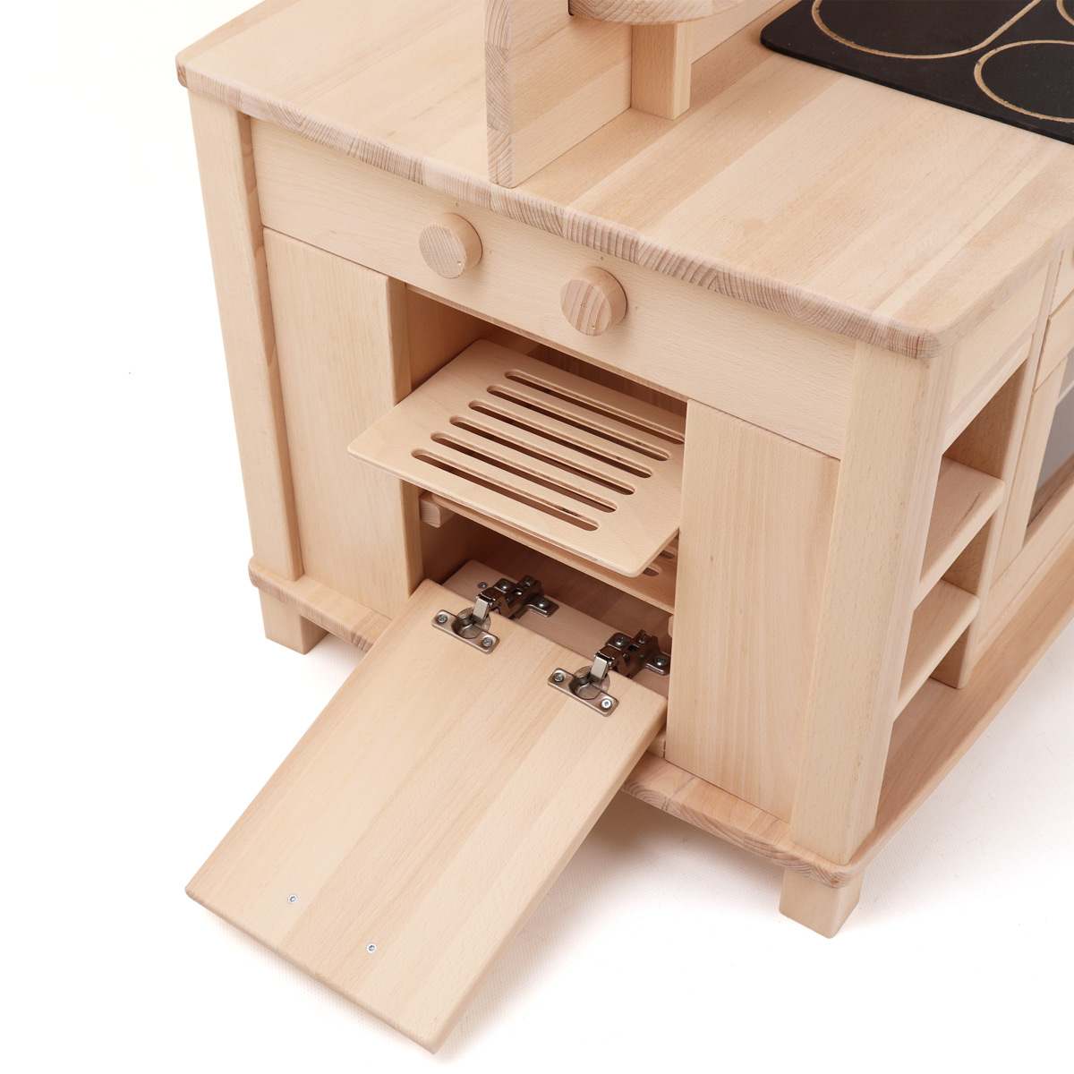 Unterhalb der Herdplatten unserer Spielküche befindet sich ein Backofen, der neben einem Schnappverschluss und einer eingearbeiteten Acrylglasscheibe auch über ein herausnehmbares Holzbackblech verfügt. Kinderbackofen und Kinderherd können mithilfe der vier drehbaren Knöpfe bedient werden, die über der Backofentür angebracht sind und ein Klickgeräusch erzeugen.