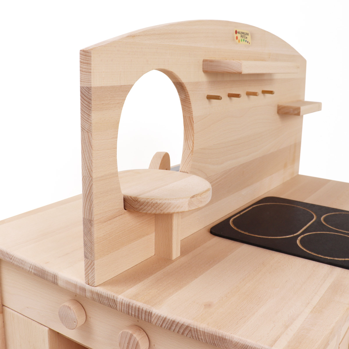 Eine Seite der großen Spielküche aus Massivholz ist mit einem Kinderherd ausgestattet, der über drei montierte Herdplatten verfügt. Bei der Kinderküche befindet sich auf beiden Seiten des Herds viel Platz zum Abstellen von Küchengeräten wie Mixer oder Toaster, der auch als Arbeitsfläche genutzt werden kann.