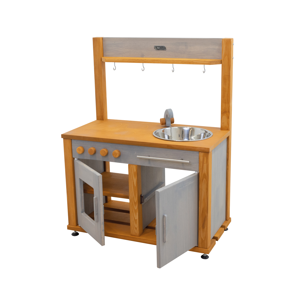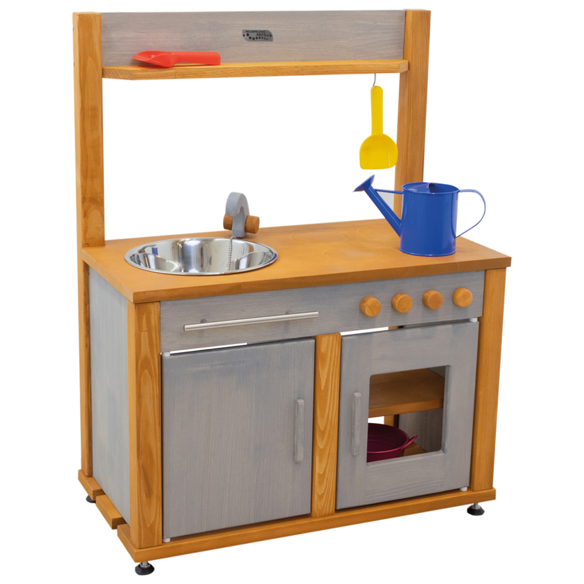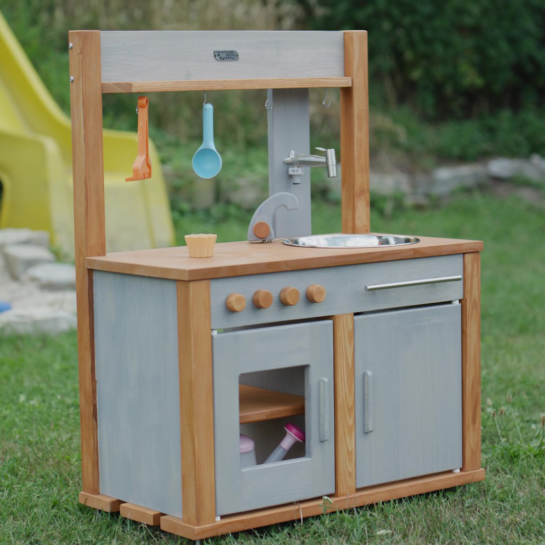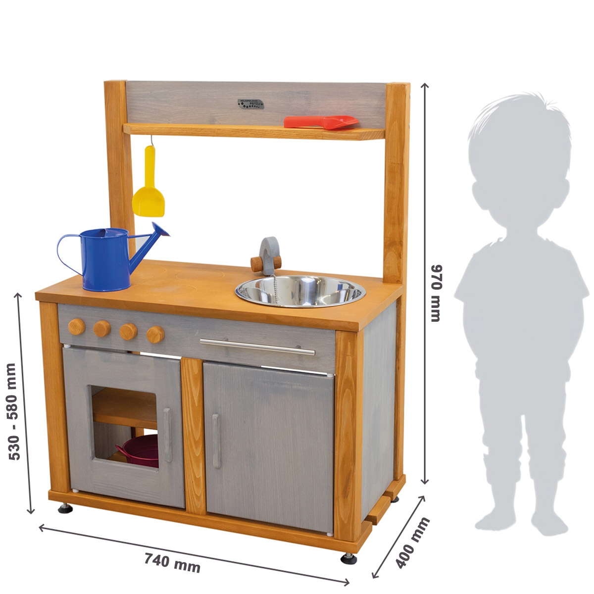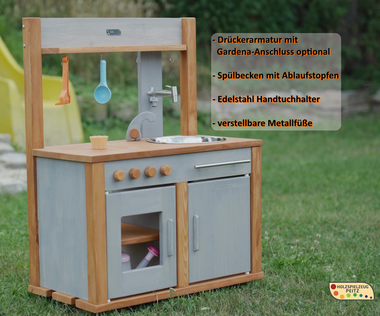 Mit unserer Kinder-Outdoor-Matschküche aus Massivholz macht der Sommer erst richtig Spaß! Die Kinder lieben das Spielen im eigenen Garten. Auch dein Kind wird mit Begeisterung Sandkuchen in der neuen Outdoor-Matschküche backen, Spaghetti auf der Herdplatte der Waldorf-Kinder-Küche für Draußen kochen. Mit dem optional hinzubestellbaren Wasserhahn mit Gardenaanschluss besitzt die Matschküche ein besonderes Highlight. Geschirr spülen, oder Wasser für das Kochen abzapfen, mit der Wasserarmatur mit Gardenaanschluss kann Ihr Kind viele Spielemöglichkeiten ausprobieren. Backen, spülen, kochen, Die höhenverstellbaren Sockelfüße sorgen dafür, dass die Küche immer die richtige Größe für dein Kind hat. Das Spielvergnügen ist deinem Kind gewiss.Garten Matschküche Details: