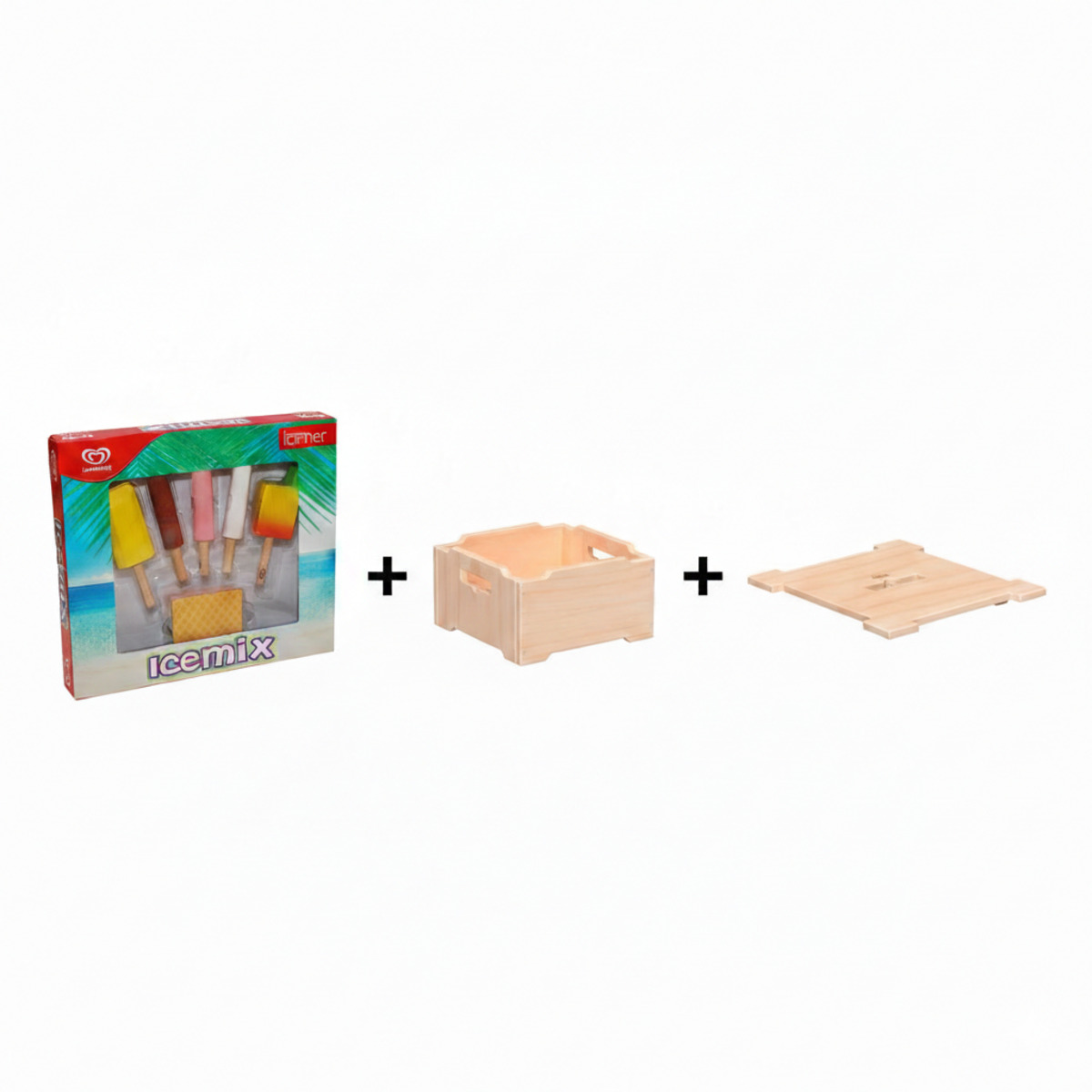 - Kombiniertes Set: Eistruhe aus Holz (Erle) inkl. Deckel & 5-teiliges Langnese Eis Set