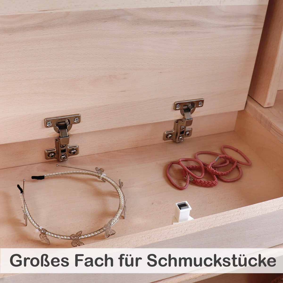 Eine wunderschöne Variante für kleine Mädchen und Jungen mit großer Vorliebe für die Natur ist der Schminktisch für Kinder. Der komplette Schminktisch ist aus massivem Buchenholz gefertigt. Der splittersichere Spiegel ist mittig platziert und somit auch die Kleinsten zum Reinschauen geeignet.Optional - Eine Kindertafel für kreative Kinder – vielfältig und fantasievoll