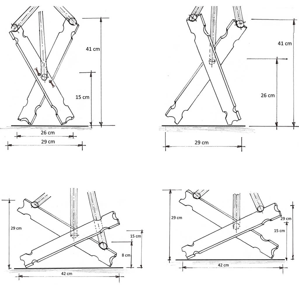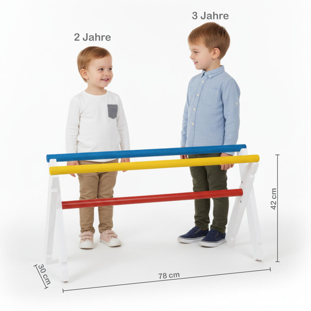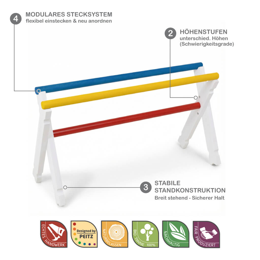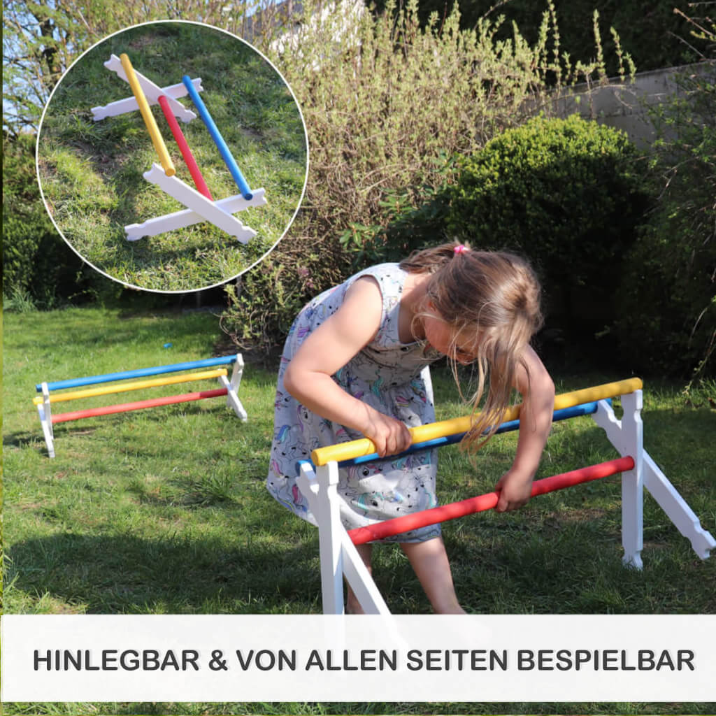 Die mittlere Stange wird fest in die seitlichen Hürden-Kreuze eingesteckt. Die beiden übrigen Stangen werden, je nach motorischen Fähigkeiten deines Kindes, auf einer bestimmten Höhe aufgelegt.