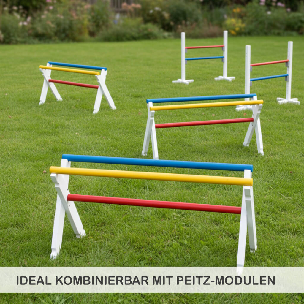 - Weiße Hürden-Kreuze und bunte Hindernis-Stangen (rot, blau und gelb)