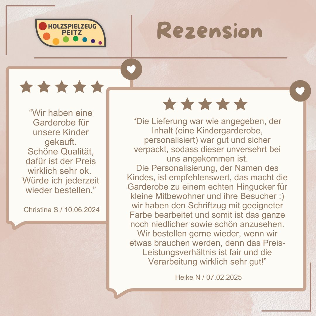 - Christina S., 10.06.2024Wir haben eine Garderobe für unsere Kinder gekauft. Schöne Qualität, dafür ist der Preis wirklich sehr ok. Würde ich jederzeit wieder bestellen.