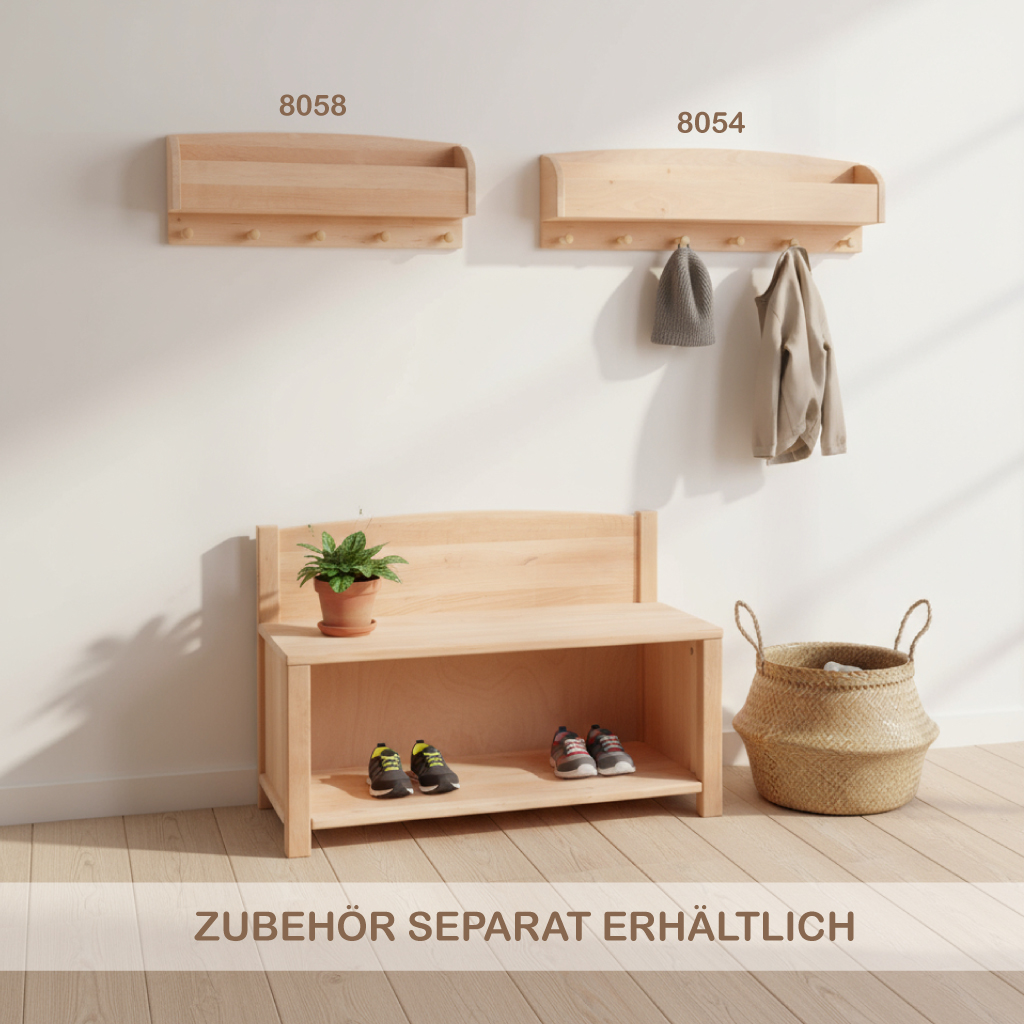 Kita Kindergarderobe mit Ablagefach im Montessori Massivholz Stil