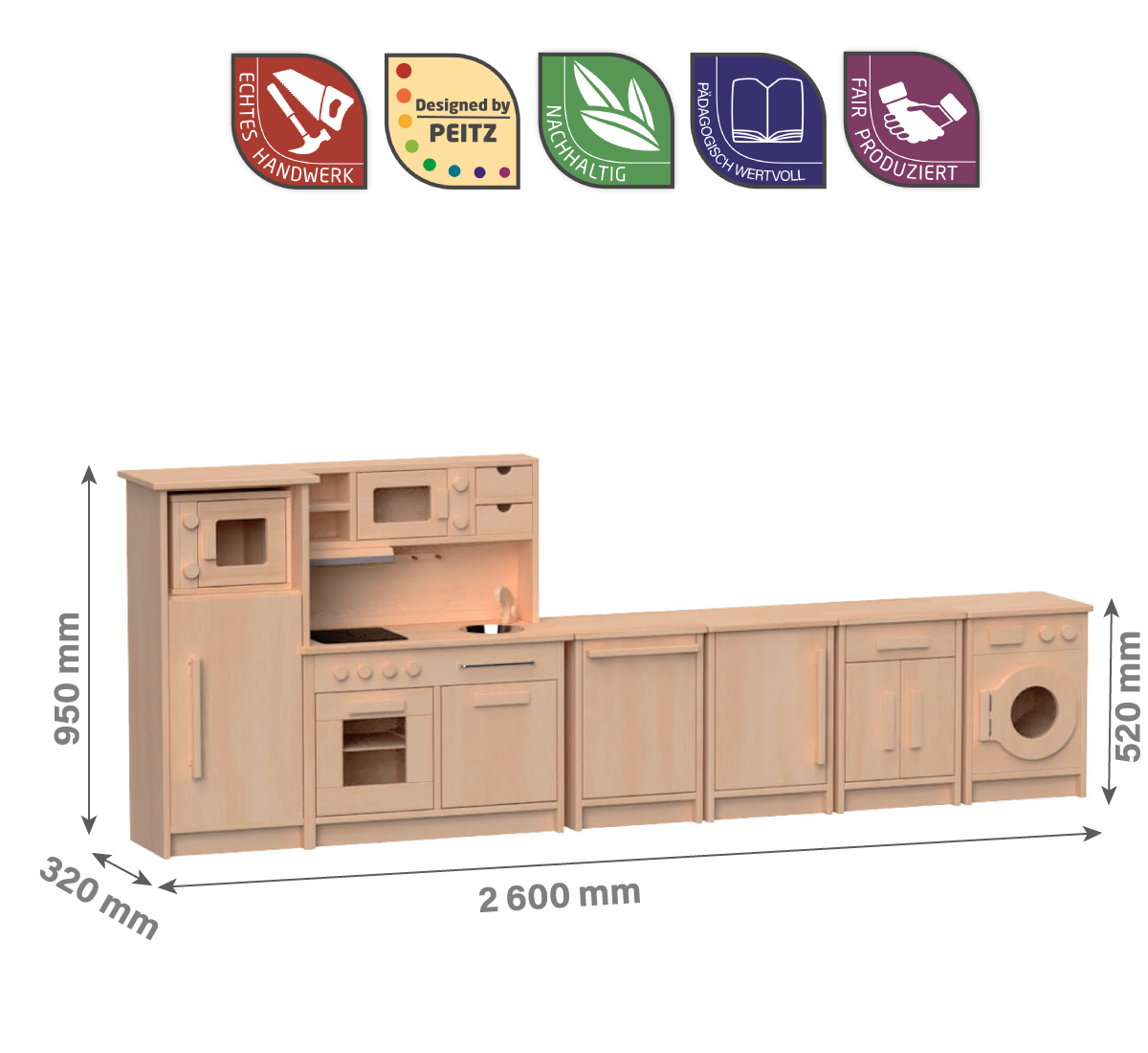 Für kleine Küchenchefs, die gerne den Erwachsenen nacheifern, ist dieses große Küchenblock Komplettset wie gemacht. Ob in der Krippen-Spielecke oder in anderen pädagogischen Einrichtung - diese XL Küchenzeile sorgt für stundenlanges, fantasievolles Rollenspiel und bietet Kindern eine komplette Haushaltsausstattung zum Kochen, Backen oder Wäschewaschen.