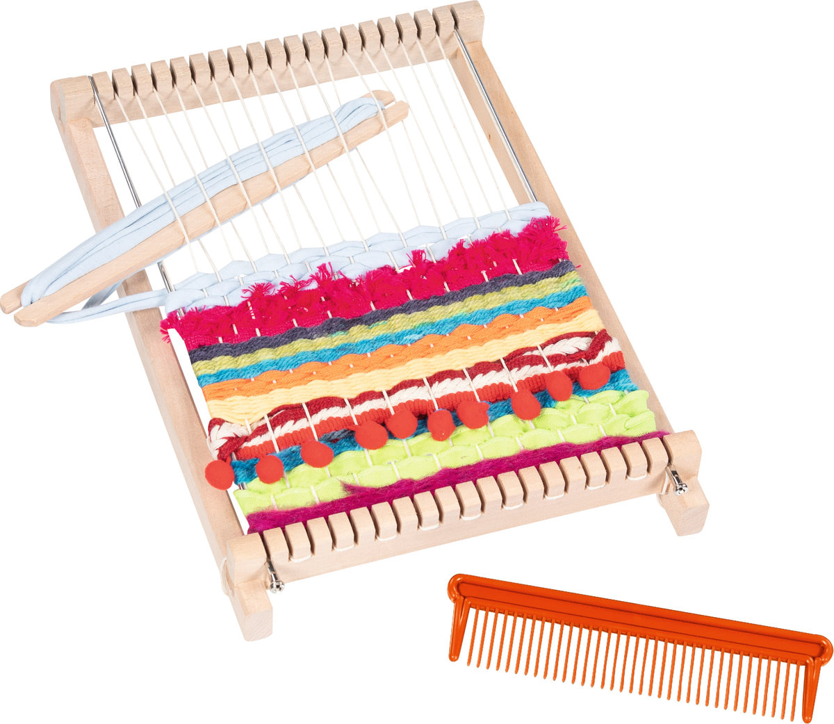 Gestell und Schiffchen aus glatt geschliffenem Holz, Kamm aus robustem Kunststoff.