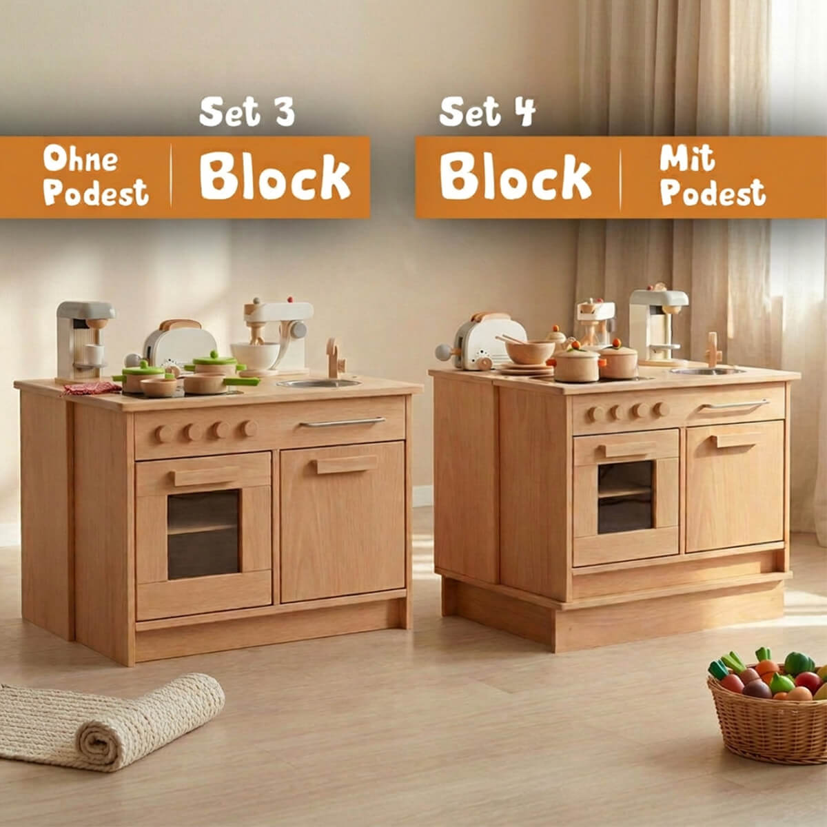 Das Sockelfüße-Set kann die Spielhöhe der Kinderküche individuell von 58 - 62 cm verändern. Die richtige Erhöhung von 5 - 9 cm kann für dein Kind eingestellt werden.