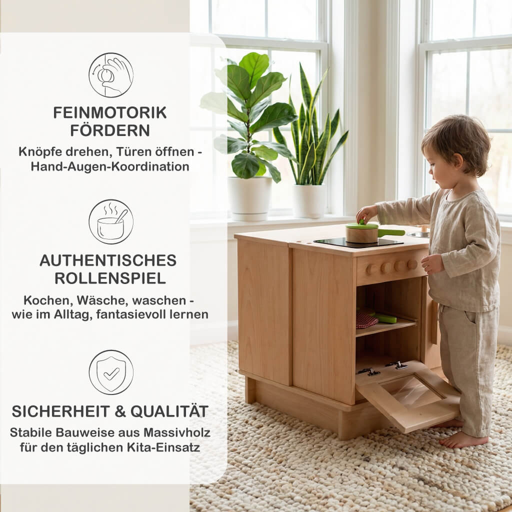 Lass die kleinen Köche und Haushalt-Helden mit dem Kinder-Küchenblock Set echte Rollenspiel-Abenteuer erleben! Dieses durchdachte Kita-Küchenblock-Set ist speziell für den Kindergarten konzipiert und bietet maximalen Spielspaß für die ganze Gruppe. Ob beim Zubereiten eines Menüs oder beim Wäschewaschen – diese Inselblock-Kinderküche vereint viele pädagogische Elemente und fördert kreatives Spielen: