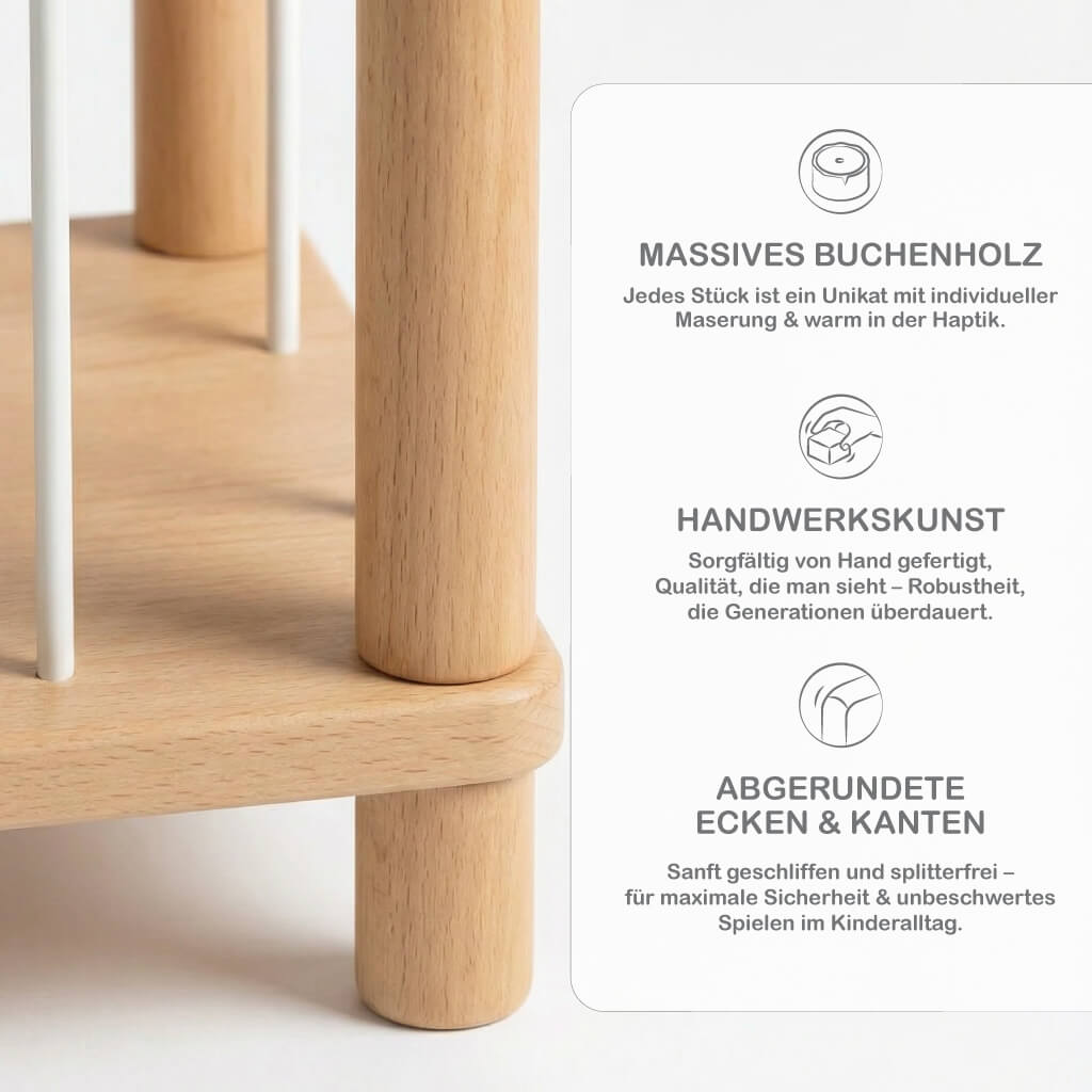 Dabei haben wir uns bewusst für massives Buchen Vollholz entschieden, welches sich durch Härte und Festigkeit auszeichnet. Robust gefertigt, erfüllt sie hohe Anforderungen an Stabilität, Langlebigkeit und pädagogischem Wert.