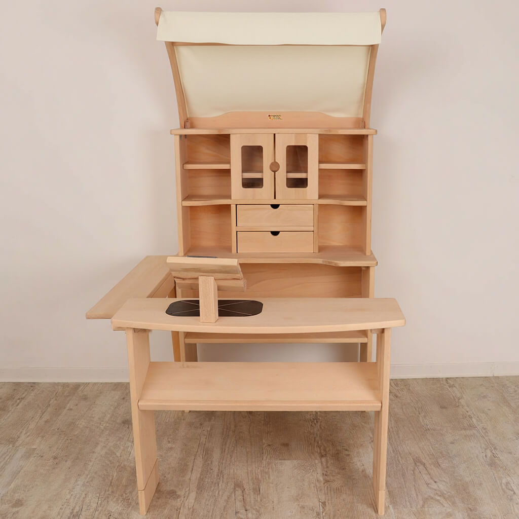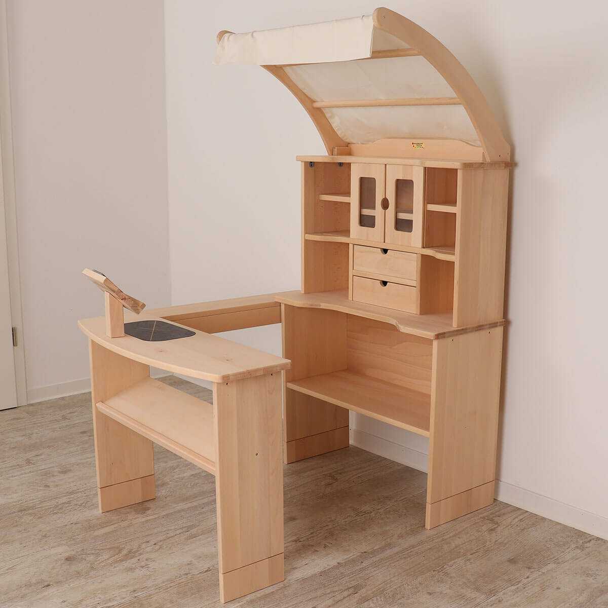 Erweitere den Kaufladen oder Kinderküche mit dieser Markise zum Markstand. Mit diesem klassischen Markisenaufbau ist der Kaufladen ein echter Hingucker. Die Markise ist aus hochwertigem Buchenholz gefertigt und mit farbenfrohen Spieltuch erhältlich. Realistisches spielen wie auf einem echten Wochenmarkt wird so möglich und Kindern viel freude bereiten beim nachspielen von Rollenspiele.