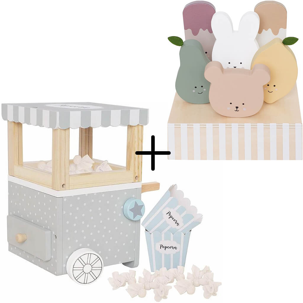 Das Popcorn-Set besteht aus einer detailreich gestalteten Holz-Popcornmaschine in zeitlosem Grau-Blau, zwei praktischen Popcornbehältern und 20 kleinen Filz-Popcorns für authentisches Verkaufserlebnis. Mit den Maßen von 22x18x24 cm passt sie perfekt in jede Kinderküche.