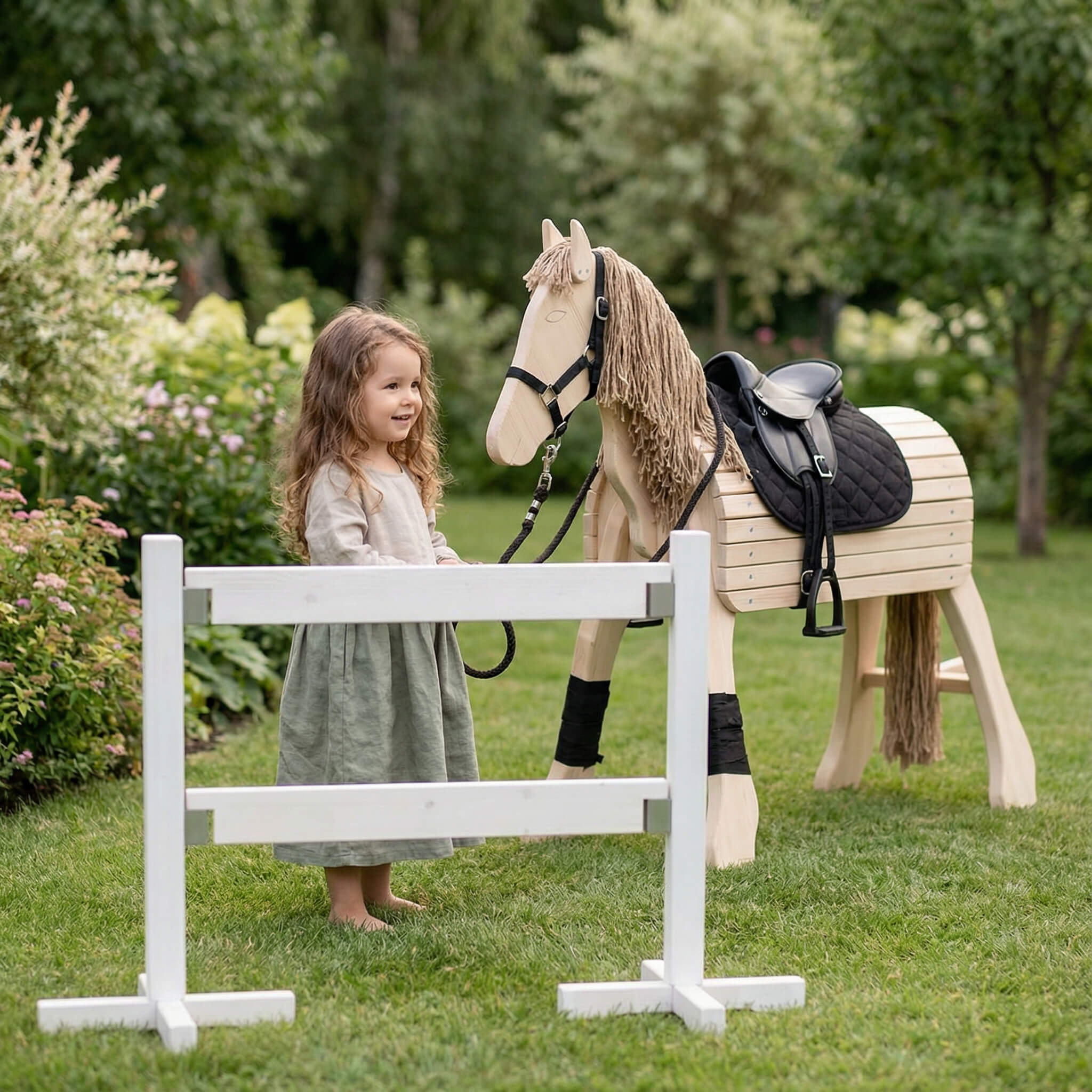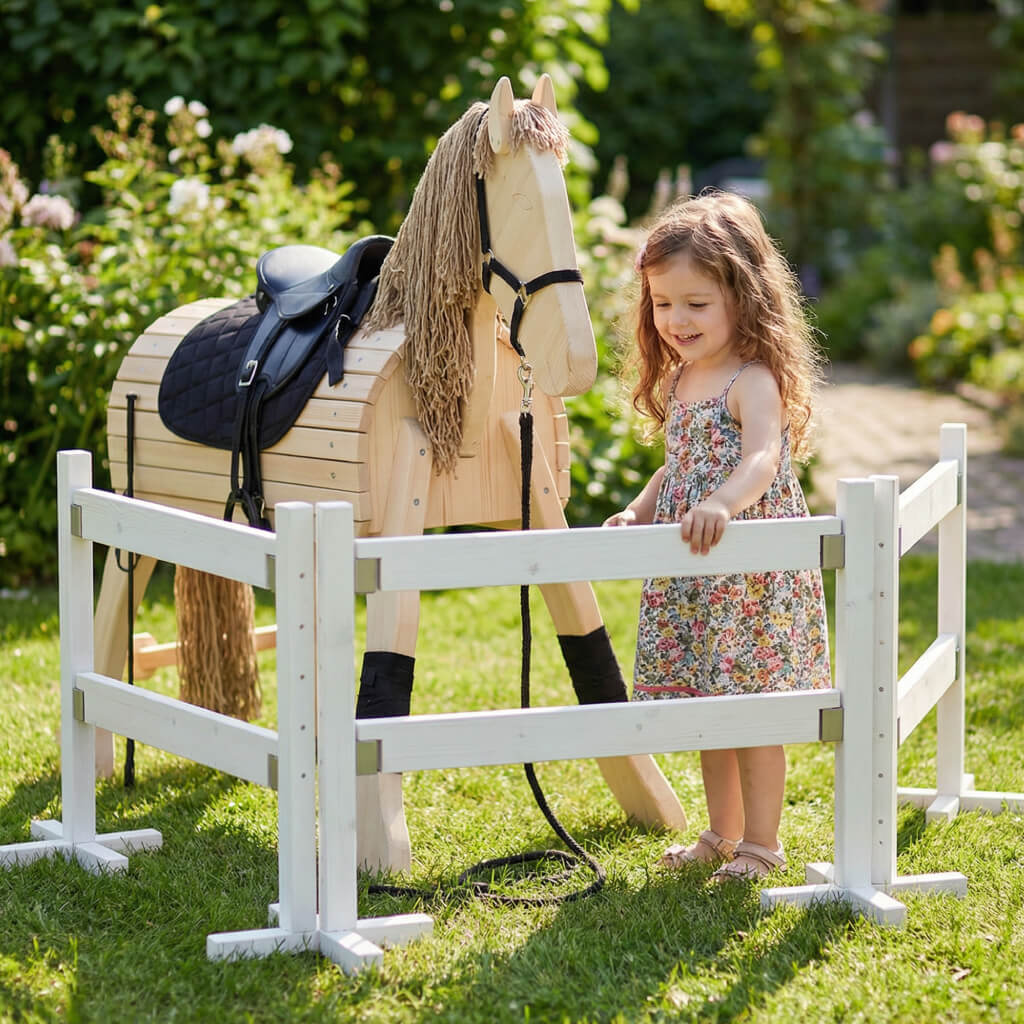 Tauchen Sie ein in die aufregende Welt der Steckenpferde und verwandeln Sie Ihren Garten oder Spielzimmer mit unserem Zubehör in eine fantastische Reitlandschaft. Unser Weidenzaun, speziell als Ergänzung für Steckenpferde entwickelt, ist das perfekte Zubehör für alle Pferdeliebhaber. Und das Beste ist: Mit unserem Erweiterungsset 7036.1 - Querstreben mit Steckklötzen können Sie nicht nur Ihren Weidenzaun nach Belieben erweitern, sondern auch Ihre Springhürde integrieren, ohne einen zusätzlichen Ständer zu benötigen.Egal, ob Sie ein komplettes Set mit Springhürde und Weidenzaun erwerben oder bereits eines der beiden Geräte besitzen, unser Erweiterungsset 7036.1 bietet Ihnen die Möglichkeit, Ihre Spielgeräte miteinander zu verbinden und Ihre Reitszenarien auf ein neues Level zu heben. Wenn Sie sowohl die Springhürde als auch den Weidenzaun besitzen, sind die Querstreben mit Steckklötzen die ideale Lösung, um eine nahtlose Erweiterung zu ermöglichen.