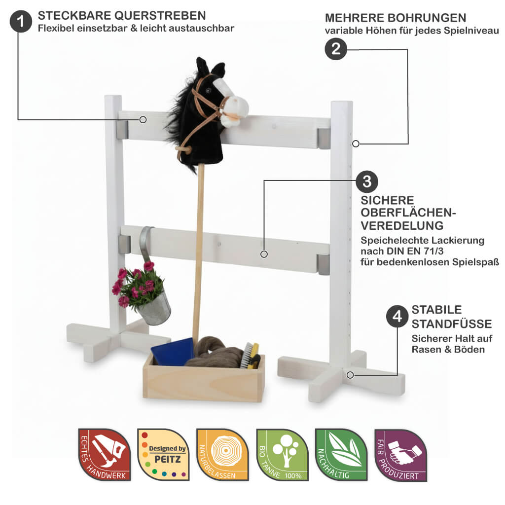 Bitte beachten Sie, dass wenn Sie nur die Springhürde oder nur den Weidenzaun erwerben, Sie beide Erweiterungssets (7036.1 und 7037.1) benötigen, um die gewünschten Anpassungen vorzunehmen. Mit unseren flexiblen Möglichkeiten des Erweiterungssets 7036.1 schaffen Sie eine einzigartige Spielumgebung für Ihre Steckenpferde und erleben unvergesslichen Spielspaß.