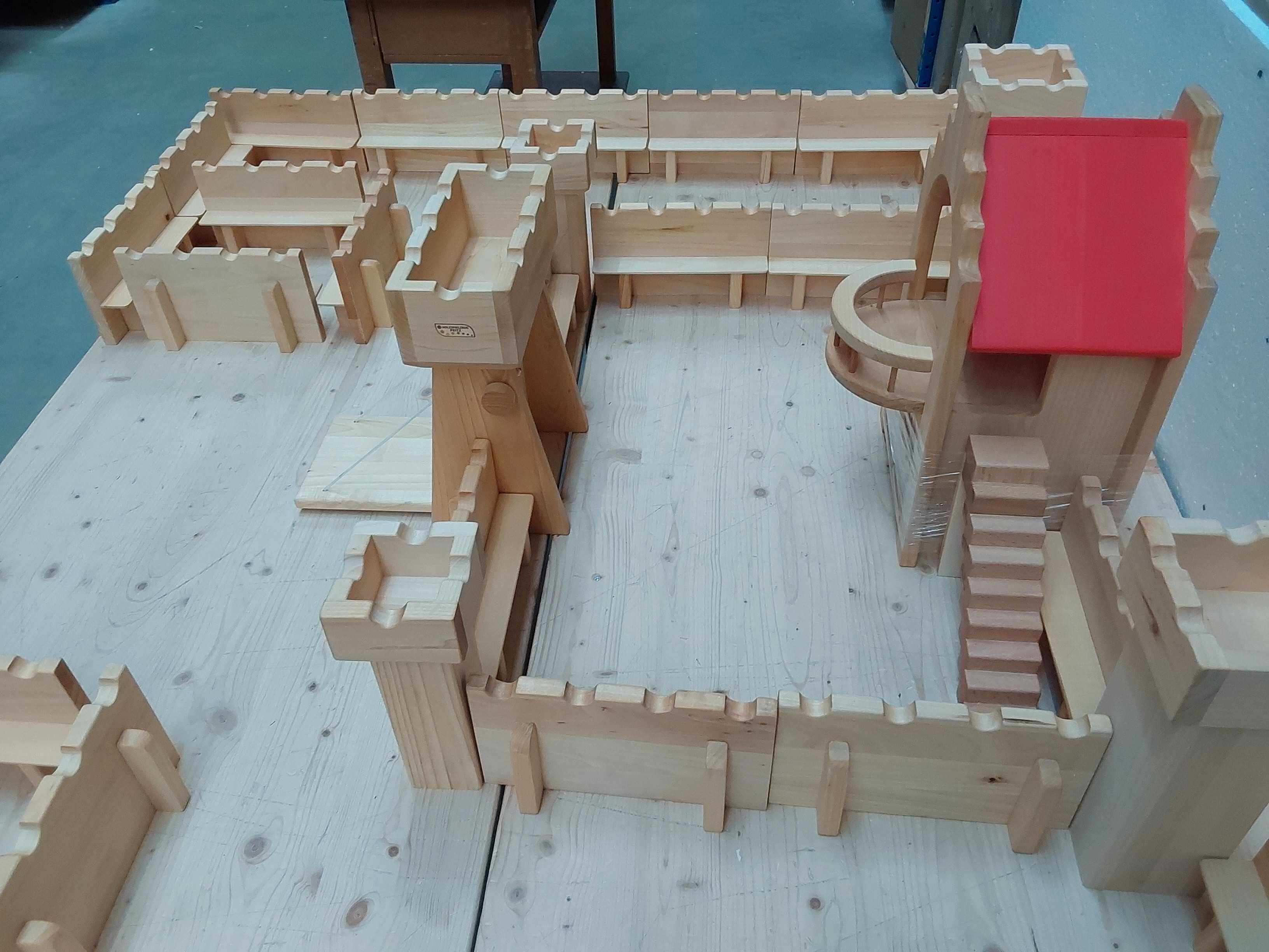 Dieses Sonderposten-Modell verfügt über 20 extra Mauerteile sowie eine Bergfried-Treppe aus Buchenholz.