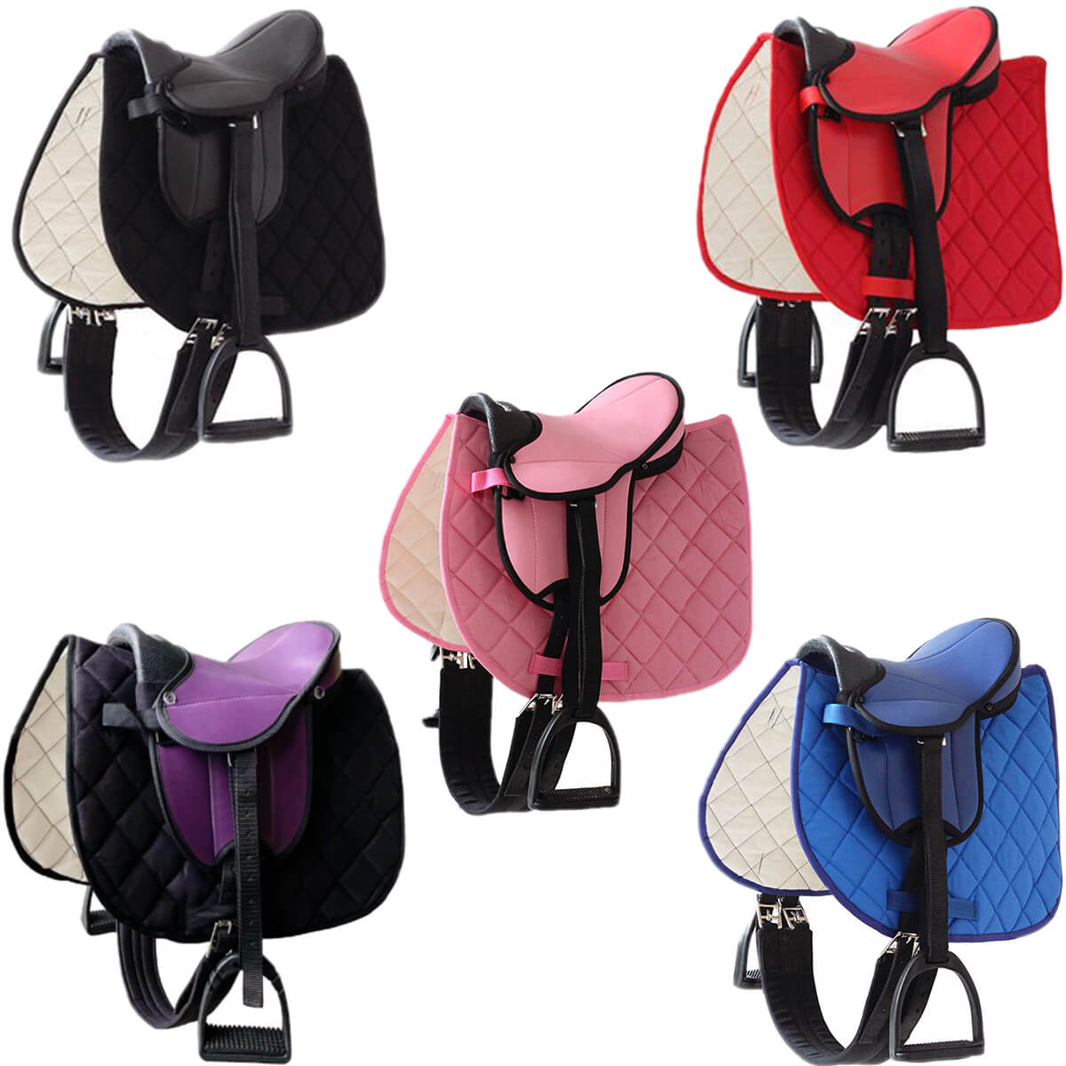 1x Pferdesattel mit Satteldecke in Wunschfarbe, 1x Sattelgurt, 1x Paar Steigbügel, 1x Schweifriemenhalterung