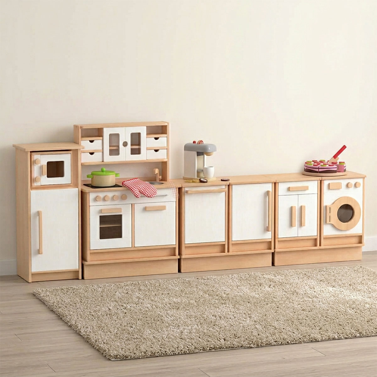 Kinder Küchegeraete Setmit Mixer, Schüssel, Toaster, Toastscheiben, Espressomaschine, Einsätze, Tasse, Kekse