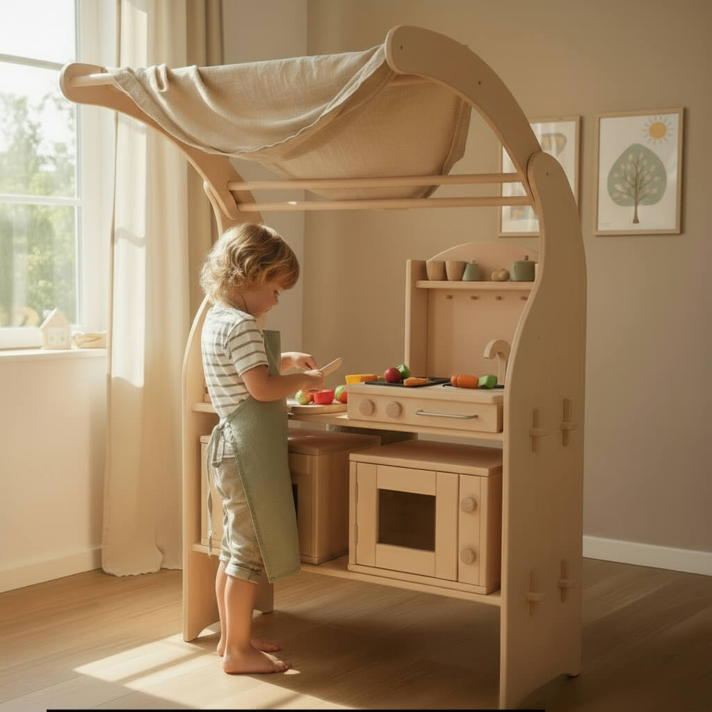 - Waldorf/Montessori inspiriertes Design: Die naturbelassene Optik und die funktionale Ausstattung fördern die Kreativität, Rollenspiel und das Alltagsverständnis