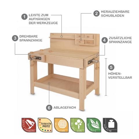 • Als schöne Ergänzung dient die optional hinzubestellbare Werkbank von Holzspielzeug Peitz